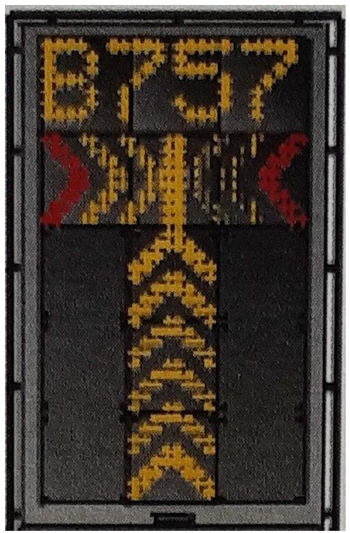 One alphanumeric display line of 4 characters made up of yellow LEDs, which may show a variety of information: stand number (when the guidance is not activated), aircraft type, docking start (WAIT TEST), excess approach speed (SLOW DOWN), stop position (STOP), aircraft parked in correct position (OK), stop position overshot (TOO FAR), aircraft detection failure (WAIT), aircraft identification fault (STOP and ID FAIL), docking interrupted (STOP SBU), docking system visibility reduced by weather conditions (DOWN GRADE).
