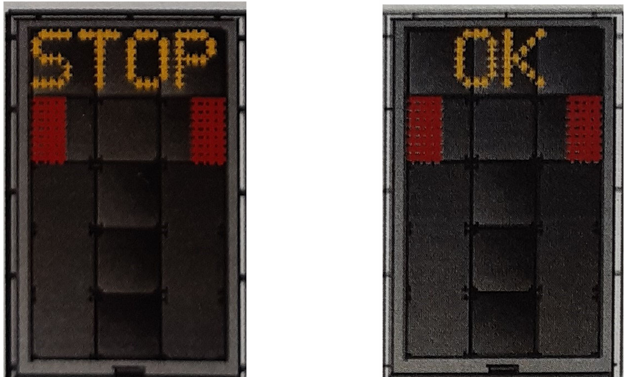 One alphanumeric display line of 4 characters made up of yellow LEDs, which may show a variety of information: stand number (when the guidance is not activated), aircraft type, docking start (WAIT TEST), excess approach speed (SLOW DOWN), stop position (STOP), aircraft parked in correct position (OK), stop position overshot (TOO FAR), aircraft detection failure (WAIT), aircraft identification fault (STOP and ID FAIL), docking interrupted (STOP SBU), docking system visibility reduced by weather conditions (DOWN GRADE).